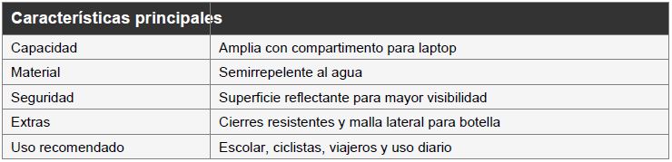 Diseñada para quienes buscan seguridad, resistencia y estilo, esta mochila combina materiales semi-impermeables y franjas reflectantes para mayor visibilidad nocturna. Ideal para uso escolar, trabajo, laptop o viajes gracias a su amplio compartimento principal, bolsillos organizadores y diseño ergonómico.